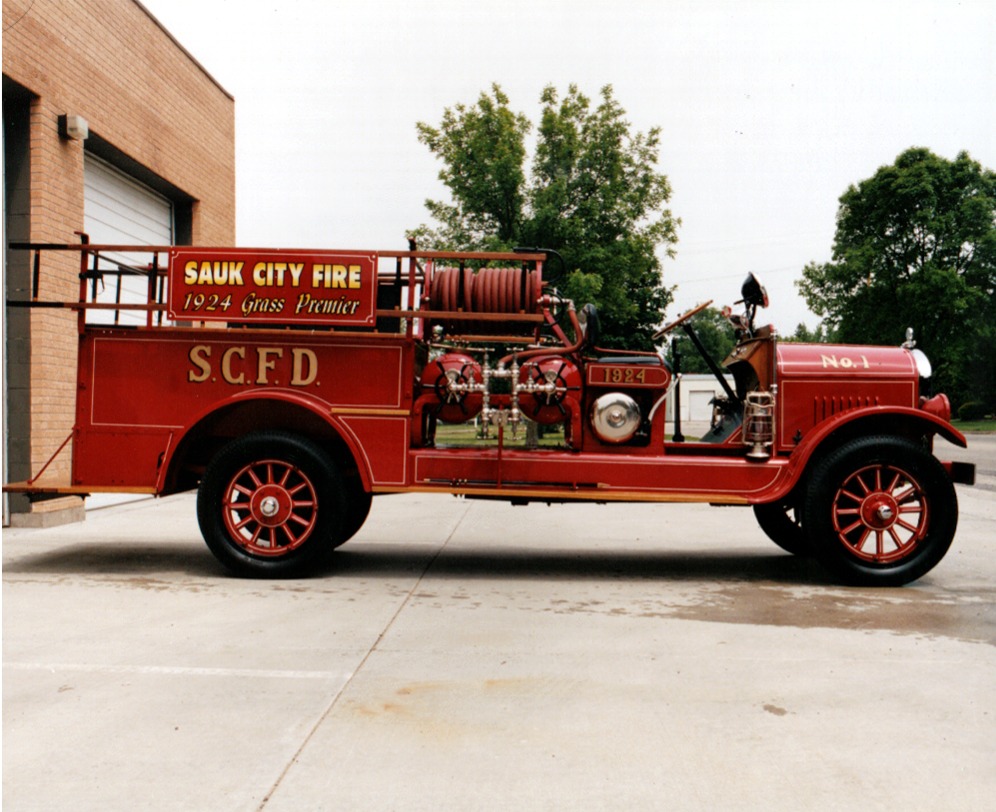 A Sauk City manufacturer built what was know as the "Grass Premier" fire engine. While only three were ever manufactured, the style and concept was replicated across the country. The Sauk City Fire Department has ownership of all three originals, with two of them restored with great care.